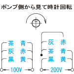 | ●使用中の油はおもいのほか汚れている場合が多く、特に3ミクロンフィルタをご使用される時は、あらかじめ10ミクロンフィルタである程度汚れを除去してからご使用ください。汚れている油をいきなり3ミクロンフィルタでろ過すると、すぐにフィルタが目詰まりする場合があります。 ●ポンプ吸入側にはポンプ保護のためサクションフィルタを設置してください(オプション)。 ●標準電圧は、100Vです。200Vでご使用の場合は下記の結線図に従ってください。 ■結線図 |